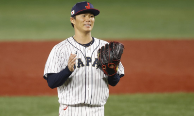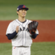 Aug 4, 2021; Yokohama, Japan; Team Japan pitcher Yoshinobu Yamamoto (17) reacts against Korea in a baseball semifinal match during the Tokyo 2020 Olympic Summer Games...