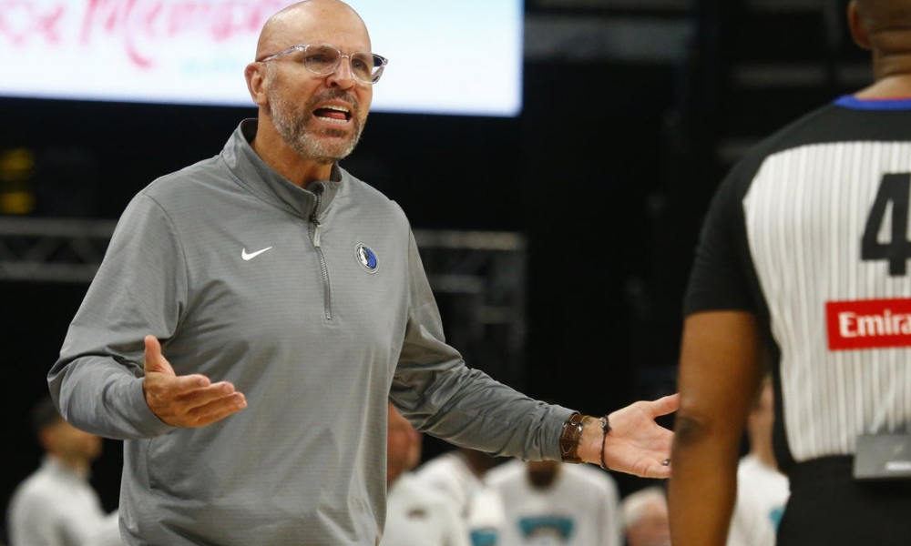 Apr 18, 2025; Memphis, Tennessee, USA; Dallas Mavericks head coach Jason Kidd reacts toward an official during the fourth quarter against the Memphis Grizzlies at FedExForum....