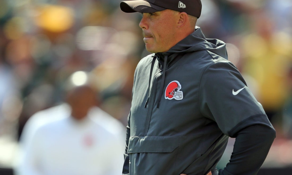 Cleveland Browns special teams coordinator Bubba Ventrone watches the team warmup before an NFL football game at Huntington Bank Field, Sept. 21, 2025, in Cleveland, Ohio....