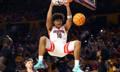 Jan 31, 2026; Tempe, Arizona, USA; Arizona Wildcats forward Koa Peat (10) screams as he slam dunks the ball against the Arizona State Sun Devils in...