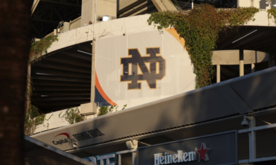 Jan 9, 2025; Miami, FL, USA; General view of the Notre Dame Fighting Irish logo before the game between the Notre Dame Fighting Irish and the...