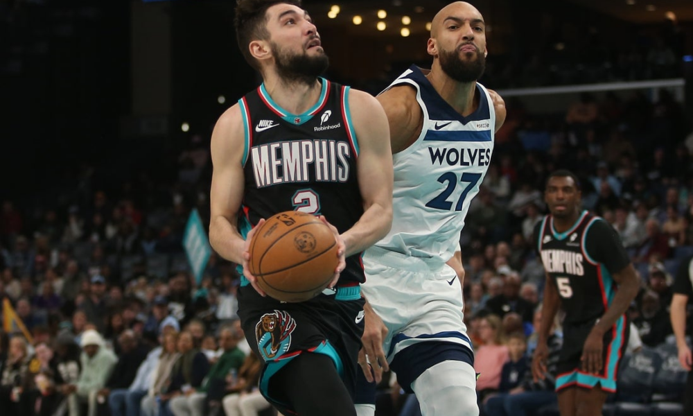 Jan 31, 2026; Memphis, Tennessee, USA; Memphis Grizzlies guard Ty Jerome (2) drives to the basket as Minnesota Timberwolves center Rudy Gobert (27) defends during the...