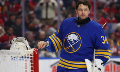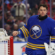 Jan 31, 2026; Buffalo, New York, USA; Buffalo Sabres goaltender Alex Lyon (34) before the start of a game against the Montréal Canadiens at KeyBank Center....