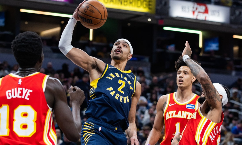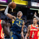 Jan 31, 2026; Indianapolis, Indiana, USA; Indiana Pacers guard/forward Andrew Nembhard (2) shoots the ball while Atlanta Hawks guard Nickeil Alexander-Walker (7) defends in the first...