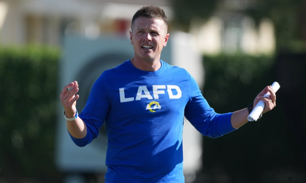 Jul 23, 2025; Los Angeles, CA, USA; Los Angeles Rams offensive coordinator Mike LaFleur during training camp at Loyola Marymount University. Mandatory Credit: Kirby Lee-Imagn Images...