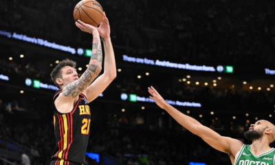 Jan 28, 2026; Boston, Massachusetts, USA; Atlanta Hawks guard Vit Krejci (27) attempts a basket against the Boston Celtics during the first half at the TD...