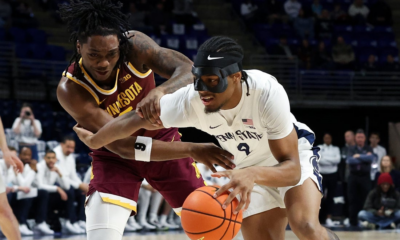 Feb 1, 2026; University Park, Pennsylvania, USA; Penn State Nittany Lions guard Kayden Mingo (4) dribbles the ball as Minnesota Golden Gophers guard Langston Reynolds (6)...