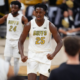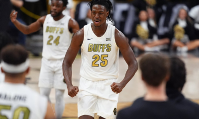 Feb 1, 2026; Boulder, Colorado, USA; Colorado Buffaloes center Fawaz Ifaola (25) reacts to a play in the first half against Texas Christian University Horned Frogs...