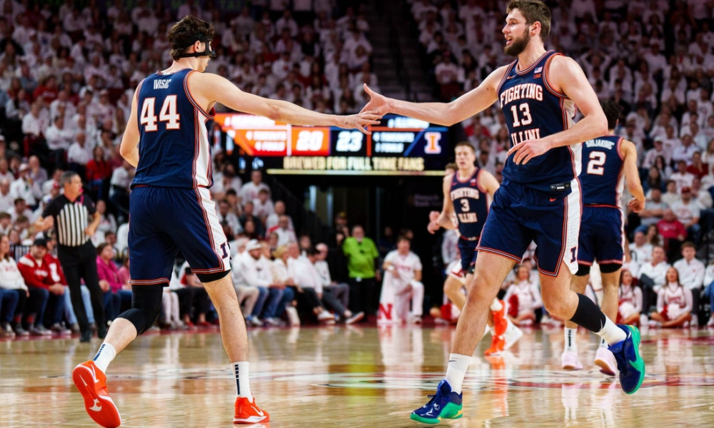 Feb 1, 2026; Lincoln, Nebraska, USA; Illinois Fighting Illini center Tomislav Ivisic (13) and center Zvonimir Ivisic (44) celebrate after a shot in the first half...