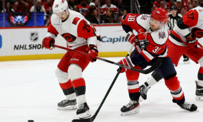 Jan 31, 2026; Washington, District of Columbia, USA; Washington Capitals defenseman Rasmus Sandin (38) takes a shot past Carolina Hurricanes center Sebastian Aho (20) during the...