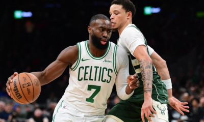 Feb 1, 2026; Boston, Massachusetts, USA; Boston Celtics guard Jaylen Brown (7) controls the ball while Milwaukee Bucks guard Ryan Rollins (13) defends during the second...