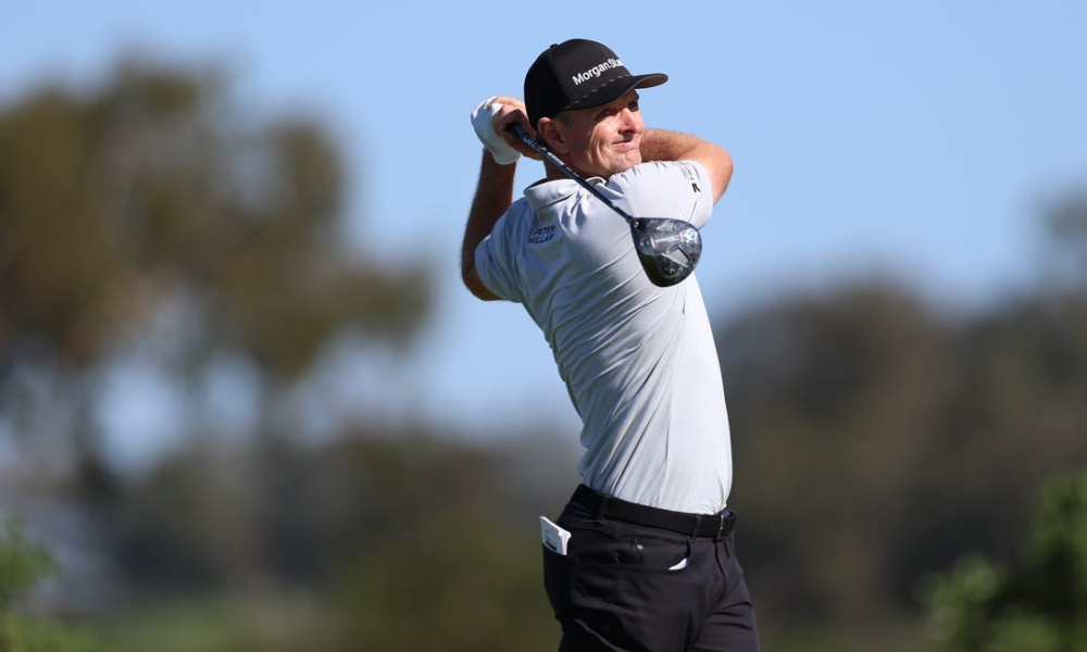 Feb 1, 2026; San Diego, California, USA; Justin Rose plays his shot from the fifth tee during the final round of the Farmers Insurance Open golf...