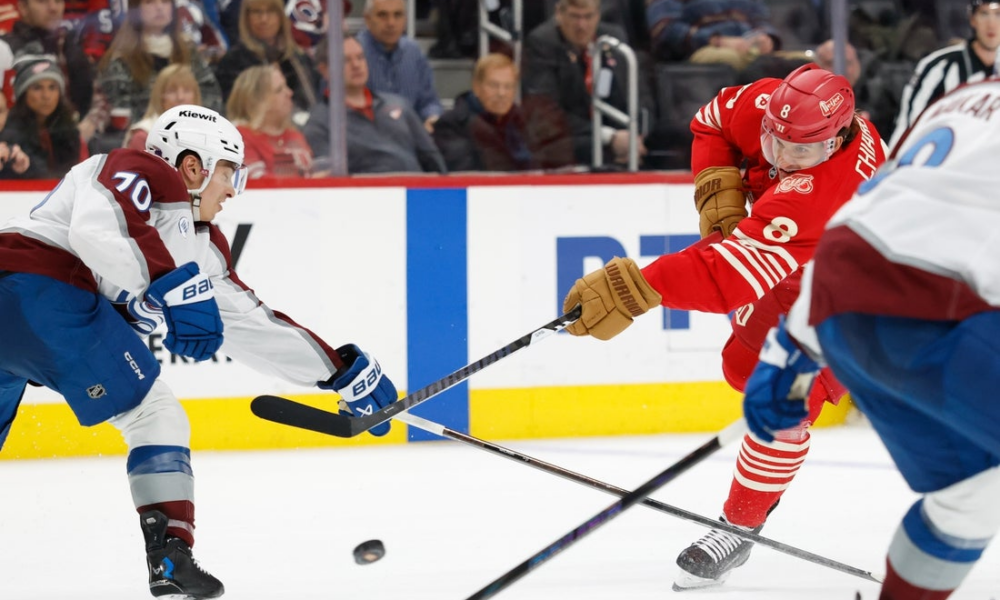 Jan 31, 2026; Detroit, Michigan, USA; Detroit Red Wings defenseman Ben Chiarot (8) shoots in the second period against the Colorado Avalanche at Little Caesars Arena....