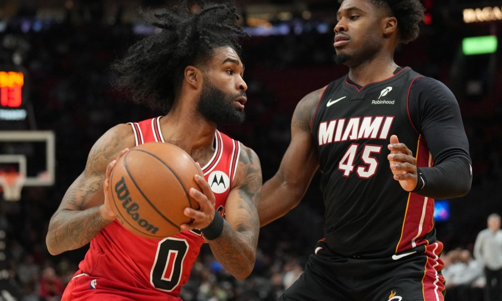 Feb 1, 2026; Miami, Florida, USA; Chicago Bulls guard Coby White (0) looks to pass as Miami Heat guard Davion Mitchell (45) defends during the first...