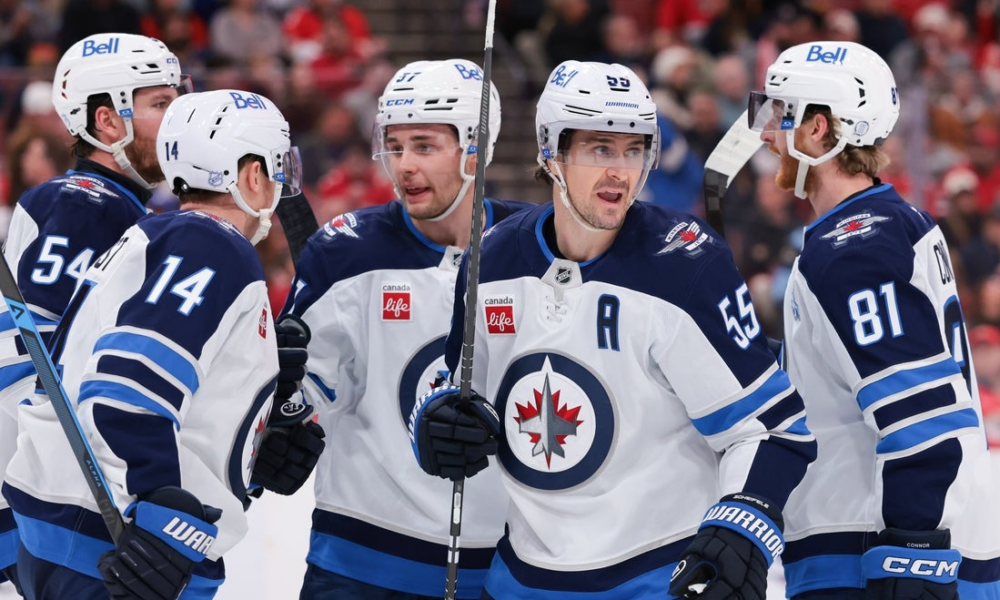 Jan 31, 2026; Sunrise, Florida, USA; Winnipeg Jets center Mark Scheifele (55) celebrates with teammates after scoring against the Florida Panthers during the third period at...
