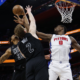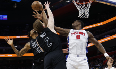 Feb 1, 2026; Detroit, Michigan, USA; Brooklyn Nets center Nic Claxton (33) forward Danny Wolf (2) and Detroit Pistons center Jalen Duren (0) goes for the...
