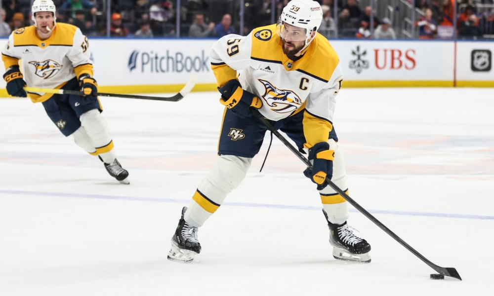 Jan 31, 2026; Elmont, New York, USA; Nashville Predators defenseman Roman Josi (59) attempts a shot on goal in the third period against the New York...