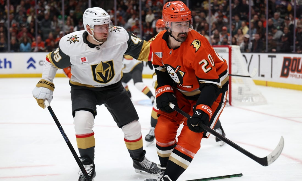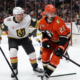 Feb 1, 2026; Anaheim, California, USA; Anaheim Ducks left wing Chris Kreider (20) fights for the puck against Vegas Golden Knights left wing Ivan Barbashev (49)...