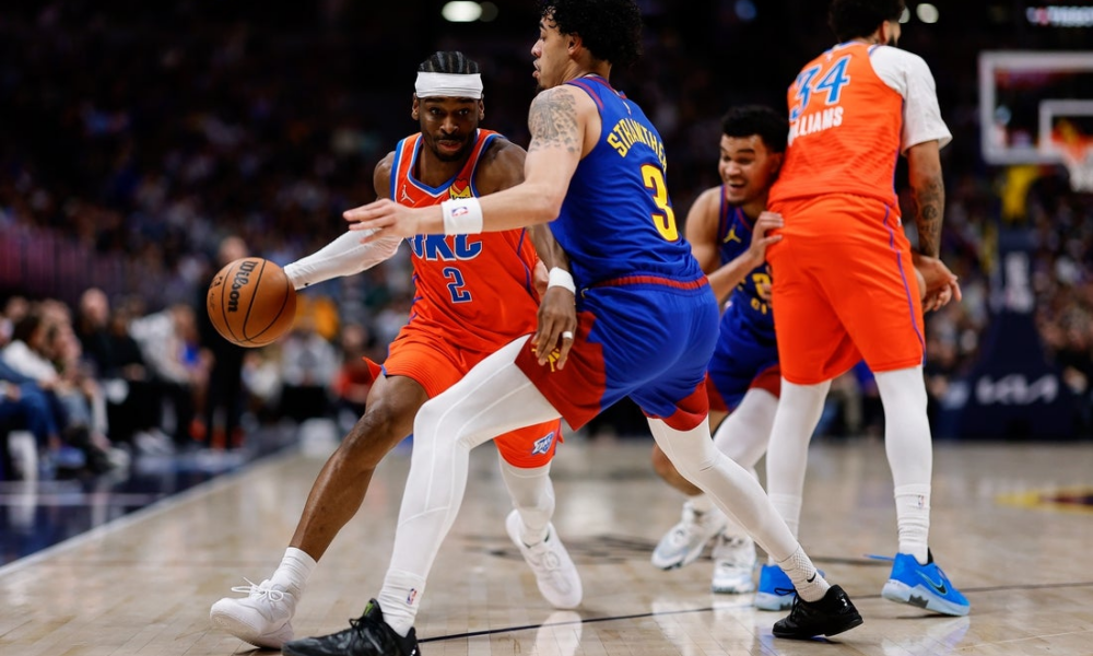 Feb 1, 2026; Denver, Colorado, USA; Oklahoma City Thunder guard Shai Gilgeous-Alexander (2) controls the ball against Denver Nuggets guard Julian Strawther (3) as guard Kenrich...