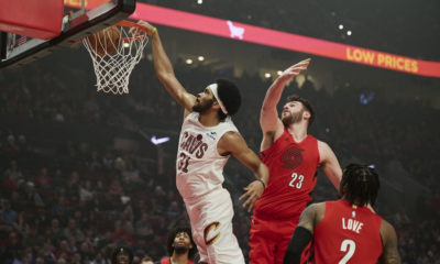 Feb 1, 2026; Portland, Oregon, USA; Cleveland Cavaliers center Jarrett Allen (31) dunks the basketball during the first half against Portland Trail Blazers center Donovan Clingan...