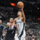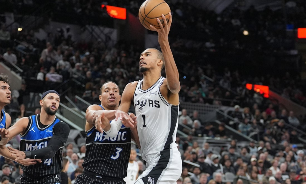 Feb 1, 2026; San Antonio, Texas, USA; San Antonio Spurs forward Victor Wembanyama (1) is fouled by Orlando Magic guard Desmond Bane (3) in the first...