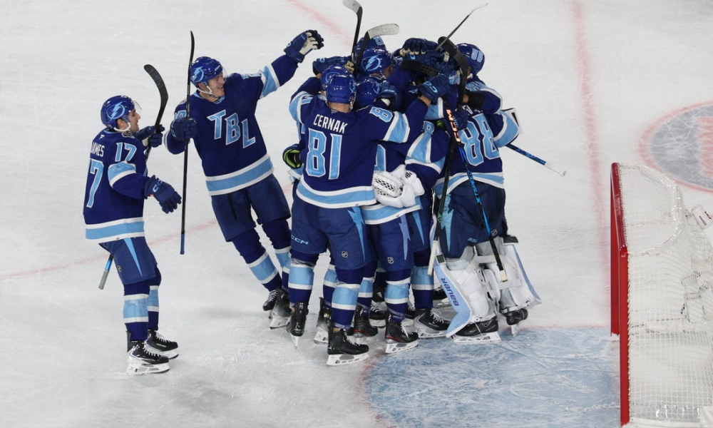 Feb 1, 2026; Tampa Bay, Florida, USA; The Tampa Bay Lightning celebrate their shootout victory in the 2026 Stadium Series ice hockey game against the Boston...
