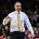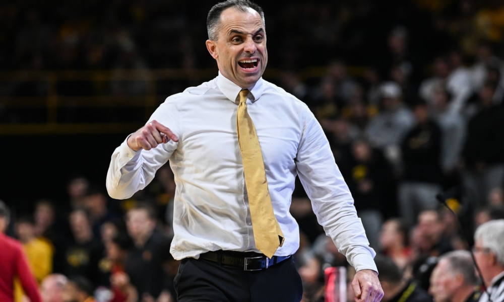 Jan 28, 2026; Iowa City, Iowa, USA; Iowa Hawkeyes head coach Ben McCollum reacts during the second half against the Southern California Trojans at Carver-Hawkeye Arena....