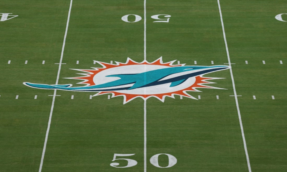 Oct 30, 2025; Miami Gardens, Florida, USA; The Miami Dolphins logo is seen at midfield prior to a game against the Baltimore Ravens at Hard Rock...