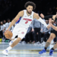 Jan 31, 2026; Charlotte, North Carolina, USA; Charlotte Hornets guard Kon Knueppel (7) is guarded by San Antonio Spurs forward Julian Champagnie (30) during the first...