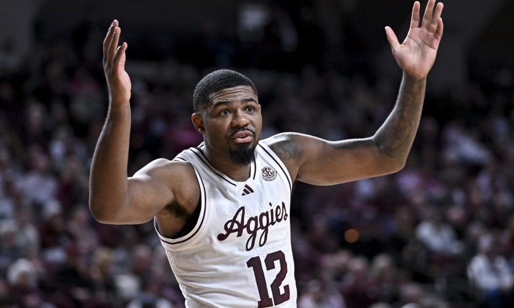 Jan 24, 2026; College Station, Texas, USA; Texas A&M Aggies forward Rashaun Agee (12) reacts during the first half against the South Carolina Gamecocks at Reed...