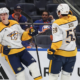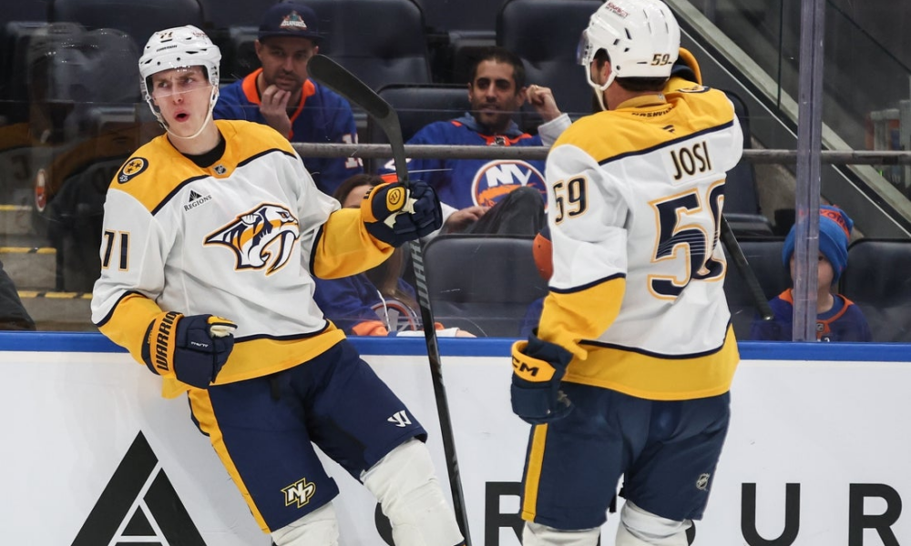 Jan 31, 2026; Elmont, New York, USA; Nashville Predators right wing Matthew Wood (71) celebrates with defenseman Roman Josi (59) after scoring a goal in the...