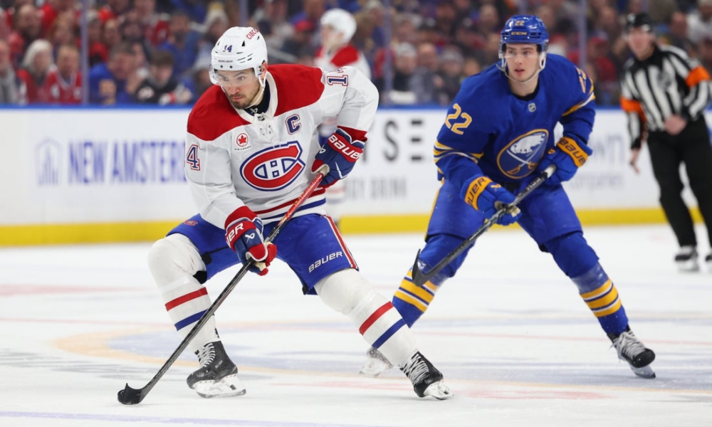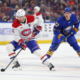 Jan 31, 2026; Buffalo, New York, USA; Buffalo Sabres right wing Jack Quinn (22) watches as Montréal Canadiens center Nick Suzuki (14) skates with the puck...