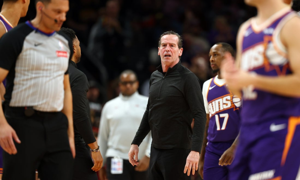 Jan 30, 2026; Phoenix, Arizona, USA; Cleveland Cavaliers head coach Kenny Atkinson reacts after being ejected from the game against the Phoenix Suns in the second...