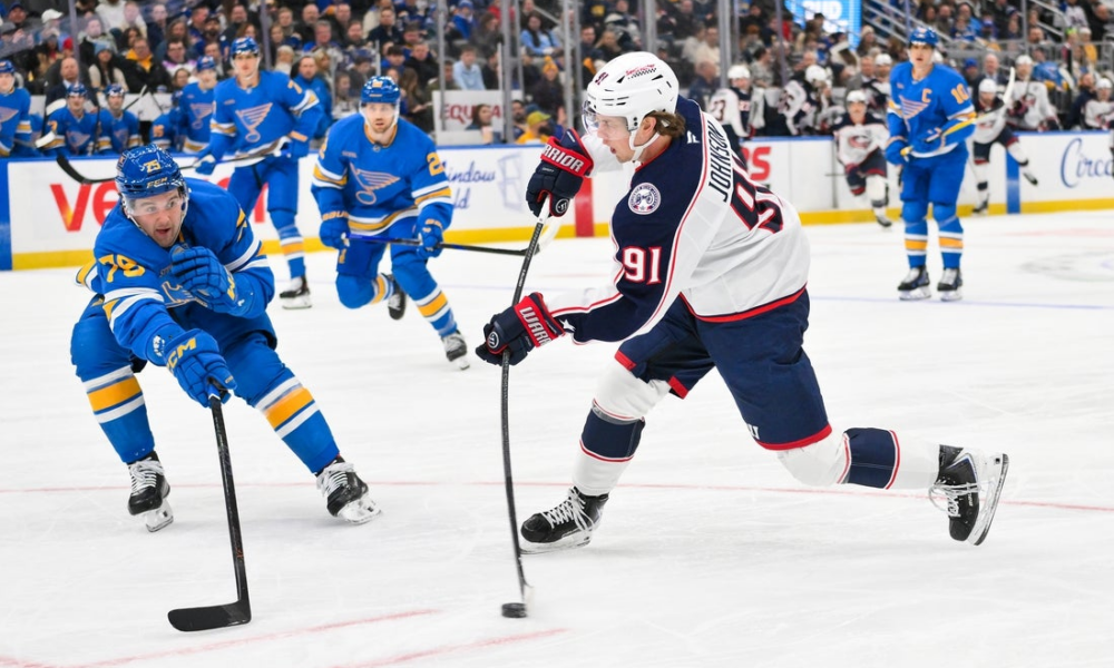 Jan 31, 2026; St. Louis, Missouri, USA; Columbus Blue Jackets center Kent Johnson (91) shoots as St. Louis Blues defenseman Tyler Tucker (75) defends during the...