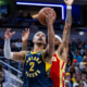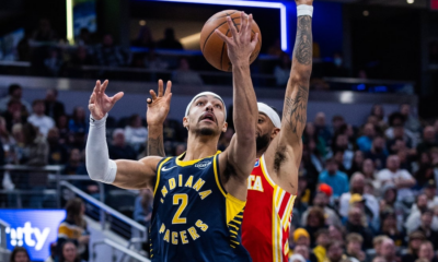 Jan 31, 2026; Indianapolis, Indiana, USA; Indiana Pacers guard/forward Andrew Nembhard (2) shoots the ball while Atlanta Hawks guard Nickeil Alexander-Walker (7) defends in the first...