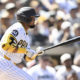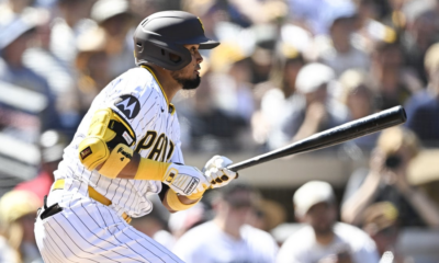 Sep 24, 2025; San Diego, California, USA; San Diego Padres first baseman Luis Arraez (4) hits a single during the first inning against the Milwaukee Brewers...