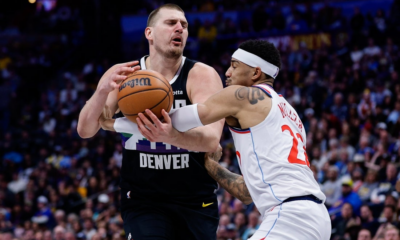 Jan 30, 2026; Denver, Colorado, USA; Denver Nuggets center Nikola Jokic (15) is fouled by Los Angeles Clippers guard Jordan Miller (22) in the fourth quarter...