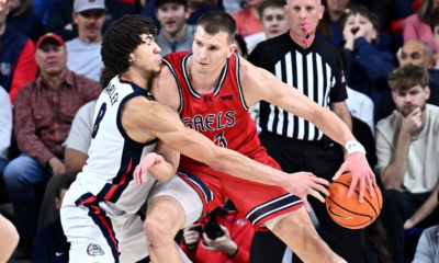 Jan 31, 2026; Spokane, Washington, USA; Gonzaga Bulldogs guard Jalen Warley (8) knocks the ball away from Saint Mary’s Gaels forward Paulius Murauskas (23) in the...