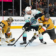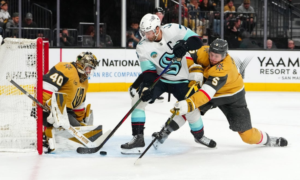 Jan 31, 2026; Las Vegas, Nevada, USA; Vegas Golden Knights goaltender Akira Schmid (40) defends his net as defenseman Jeremy Lauzon (5) breaks up a scoring...