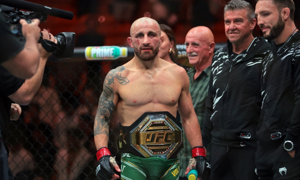 Apr 12, 2025; Miami, Florida, UNITED STATES; Alexander Volkanovski (red gloves) reacts after defeating Diego Lopes (not pictured) during UFC 314 at Kaseya Center. Mandatory Credit:...