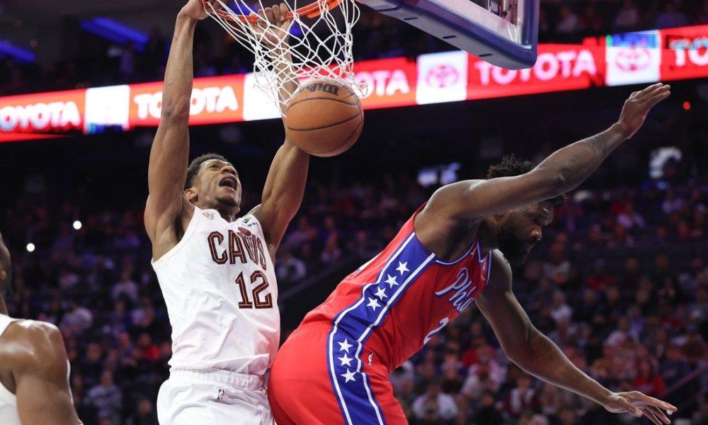 Jan 16, 2026; Philadelphia, Pennsylvania, USA; Cleveland Cavaliers forward De’andre Hunter (12) dunks the ball past Philadelphia 76ers center Joel Embiid (21) during the fourth quarter...