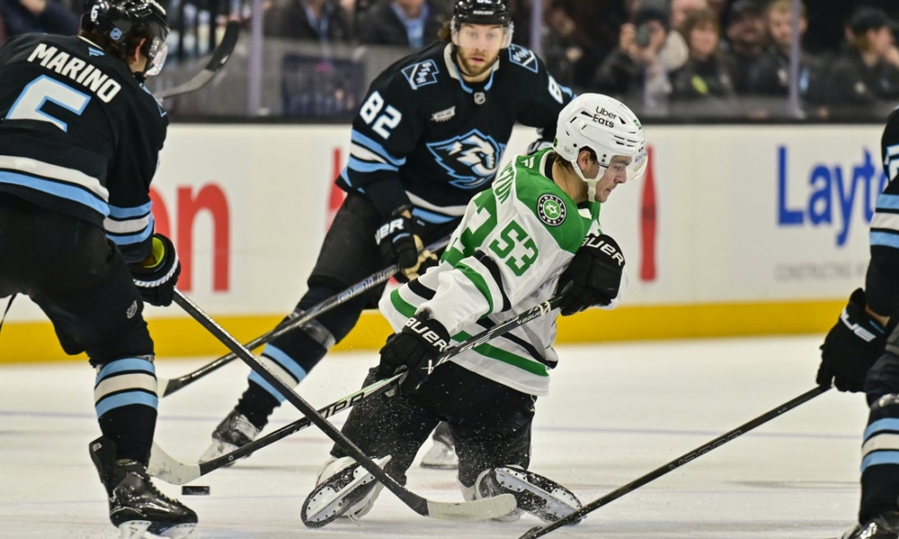 Jan 31, 2026; Salt Lake City, Utah, USA; Dallas Stars center Wyatt Johnston (53) makes a pass behind the back during first period around Utah Mammoth...