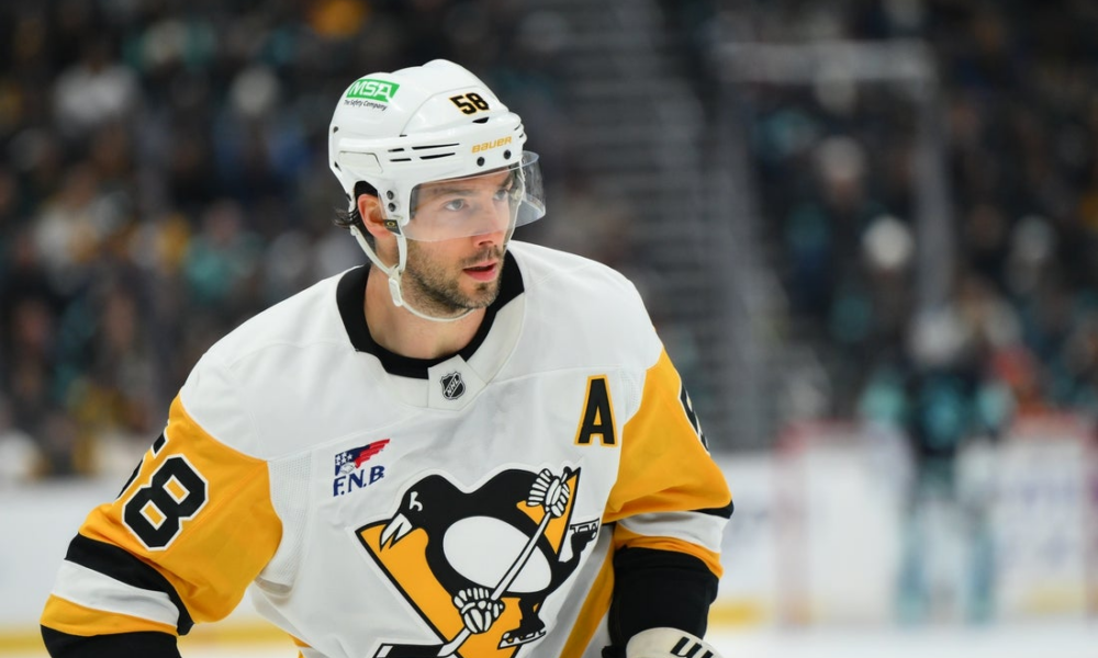 Jan 19, 2026; Seattle, Washington, USA; Pittsburgh Penguins defenseman Kris Letang (58) during the third period against the Seattle Kraken at Climate Pledge Arena. Mandatory Credit:...