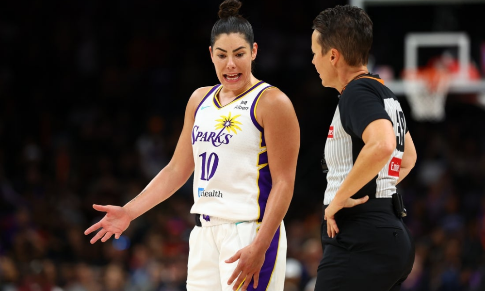 Sep 9, 2025; Phoenix, Arizona, USA; Los Angeles Sparks guard Kelsey Plum (10) talks with WNBA referee Gina Cross against the Phoenix Mercury during a WNBA...