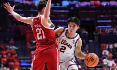 Dec 13, 2025; Champaign, Illinois, USA; Illinois Fighting Illini guard Andrej Stojakovic (2) drives the ball around Nebraska Cornhuskers forward Pryce Sandfort (21) during the first...