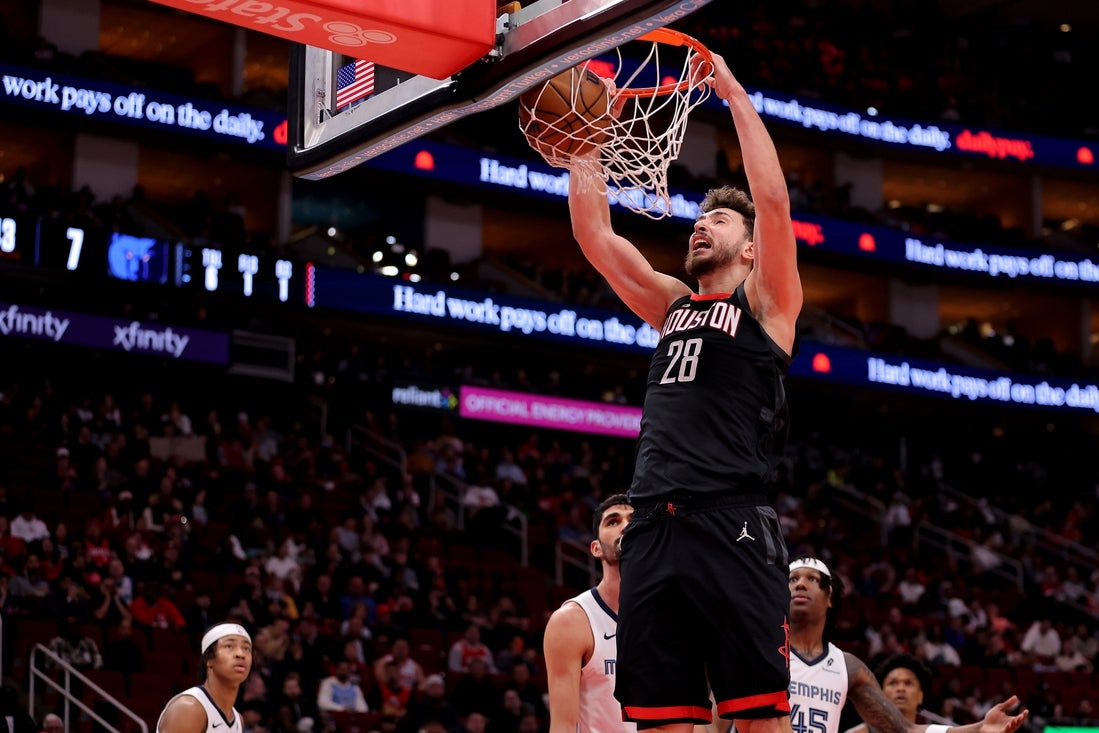 Jan 26, 2026; Houston, Texas, USA; Houston Rockets center Alperen Sengun (28) dunks against the Memphis Grizzlies during the first quarter at Toyota Center. Mandatory Credit: Erik Williams-Imagn Images Alperen Sengun and Kevin Durant tallied 33 points apiece to fuel the Houston Rockets to a 108-99 comeback victory at home over the short-handed Memphis Grizzlies on Monday.