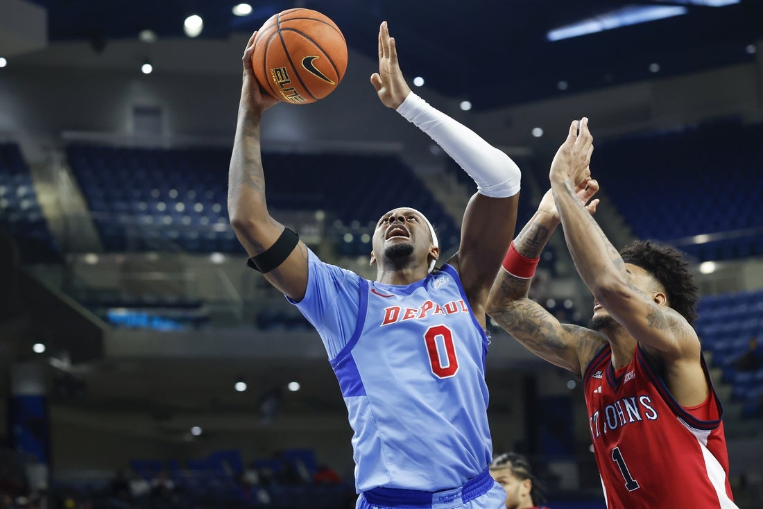 Feb 3, 2026; Chicago, Illinois, USA; DePaul Blue Demons guard Brandon MacLin (0) goes to the basket against St. John’s Red Storm forward Dillon Mitchell (1) during the second half at Wintrust Arena. Mandatory Credit: Kamil Krzaczynski-Imagn Images Providence coach Kim English hopes that, finally, his team has another win it can build off in Big East play.