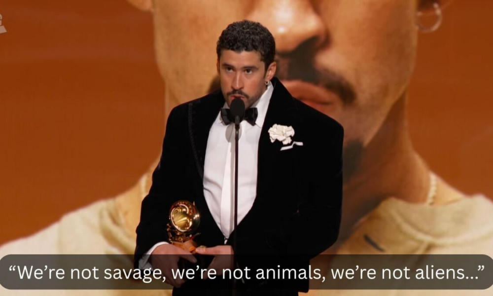 “Before I say thanks to God, I’m gonna say ICE out. We’re not savage, we’re not animals, we’re not aliens, we are humans, and we are Americans,” says Bad Bunny in the clip above.