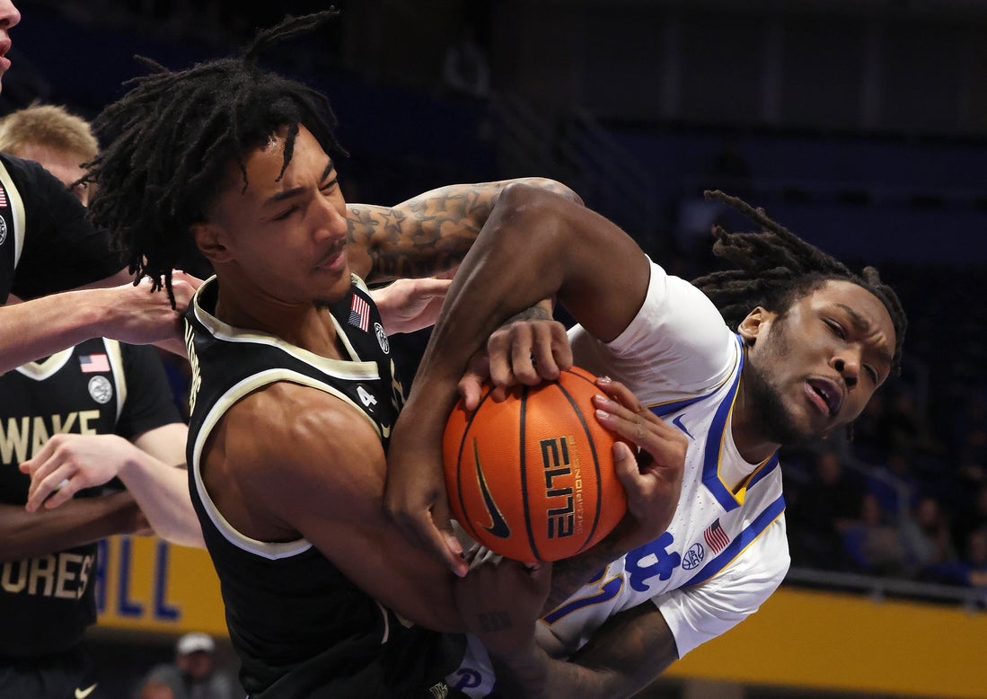Jan 27, 2026; Pittsburgh, Pennsylvania, USA; Wake Forest Demon Deacons forward Juke Harris (left) and Pittsburgh Panthers guard MacAri Moore (right) fight for a rebound during the first half at the Petersen Events Center. Mandatory Credit: Charles LeClaire-Imagn Images Omari Witherspoon’s go-ahead jumper with 15 seconds left powered host Pittsburgh to an 80-76 Atlantic Coast Conference win over Wake Forest on Tuesday night.