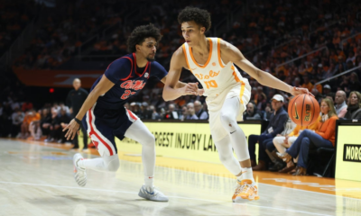Feb 3, 2026; Knoxville, Tennessee, USA; Tennessee Volunteers forward Nate Ament (10) moves the ball against Mississippi Rebels guard Patton Pinkins (23) during the first half at Thompson-Boling Arena at Food City Center. Mandatory Credit: Randy Sartin-Imagn Images Nate Ament scored 28 points, Ja’kobi Gillespie added 20 and No. 25 Tennessee rode a second-half surge to win its fourth consecutive game by defeating Ole Miss 84-66 on Tuesday night in Knoxville, Tenn.